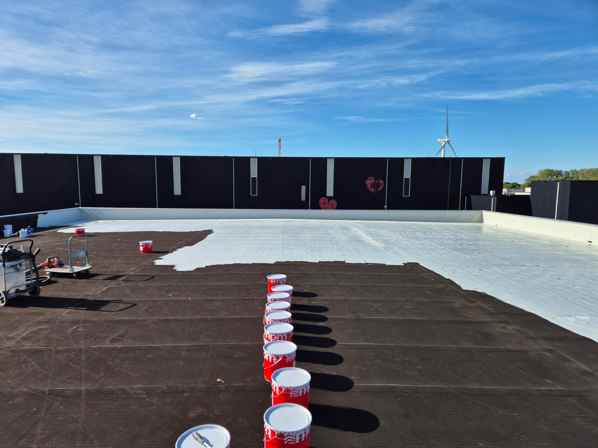De besparing is tweeledig. Ten eerste bespaart u direct ca. 50-70% ten opzichte van een traditionele dakvervanging, omdat er geen sloop- en stortkosten zijn. Ten tweede zorgt onze witte 'Cool Roof' coating voor reflectie van zonlicht, wat de binnentemperatuur drastisch verlaagt. Dit levert een aanzienlijke besparing op uw energiekosten voor airconditioning op.